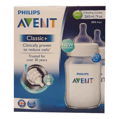 Easy to clean and assemble, anti colic system. Suitable for 1+ Month babies. Size 9oz. Includes 2 Bottles.