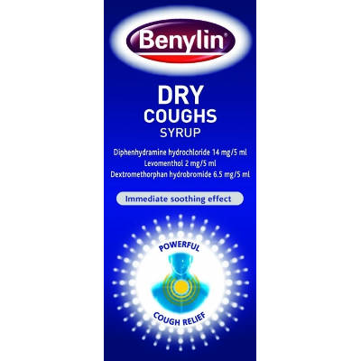Benylin Dry Coughs Syrup soothes and relieves dry irritating coughs. Benylin Dry Coughs starts working the moment you swallow, to ease irritation caused by dry coughs. It contains powerful cough suppressants to help stop the cough and an antihistamine which relieves coughing as well as drying up secretions in the nose and chest.