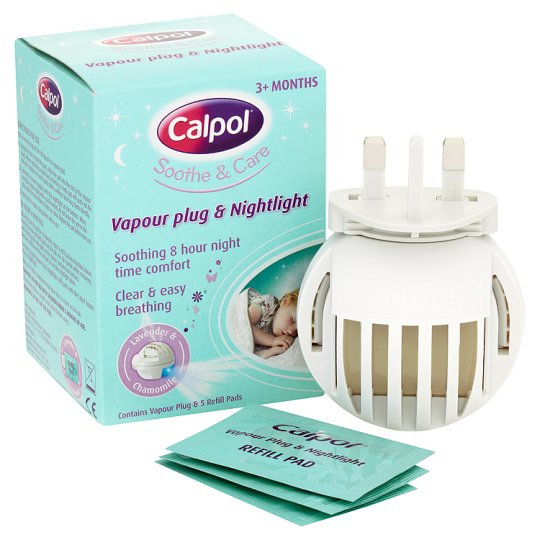 Calpol vapour plug and nighthlight contains a blend of aromatic oils including lavender, chamomile, menthol, camphor and eucalyptus.