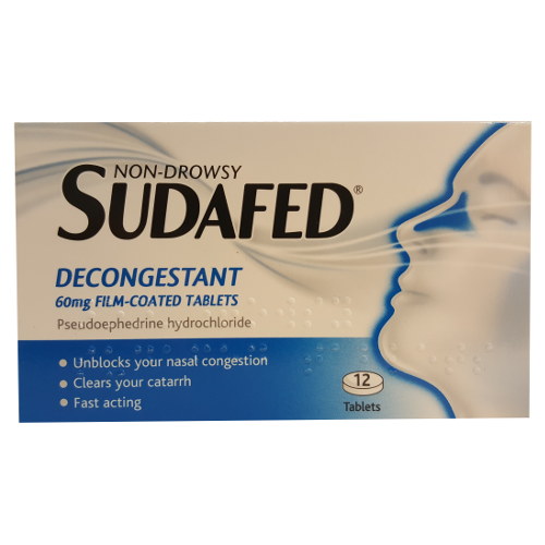 Sudafed Decongestant Tablets with Pseudoephedrine hydrochloride, helps clear stuffy noses, catarrh, blocked sinuses and sinus pressure associated with colds, flu and allergies.